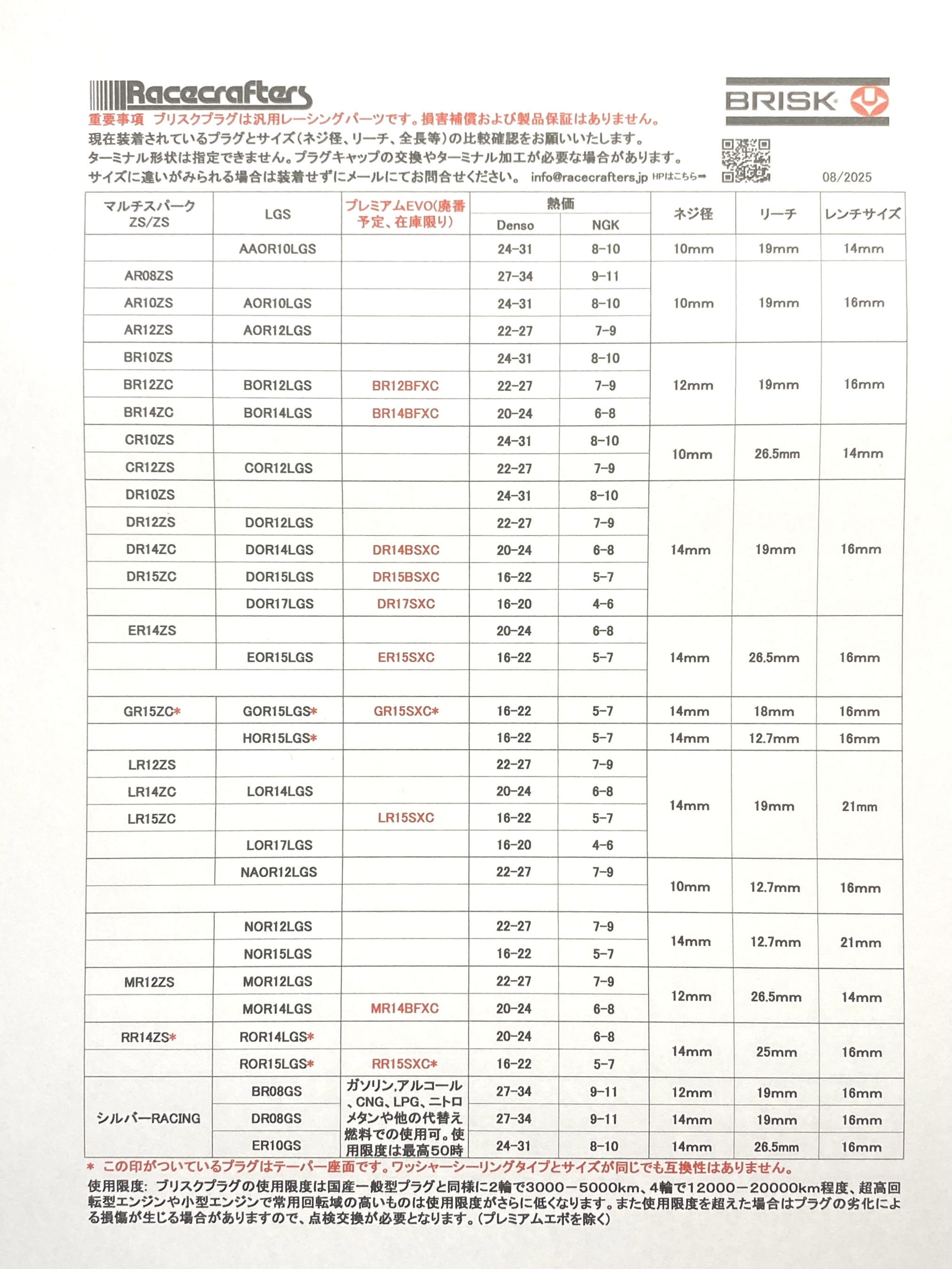 *ブリスクプラグの熱価はワイドレンジ(マルチグレード)です。NGK相当で3番分あります。